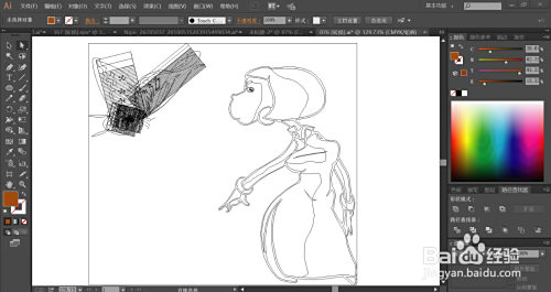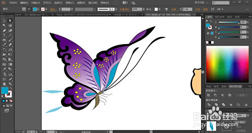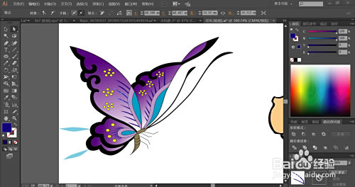 利用暗紫色到淡紫色的渐变填充蝴蝶的同党,再用黑色对于蝴蝶的同党进行描边,利用黑色填充蝴蝶的触角,利用土灰色填充蝴蝶的身体路径。