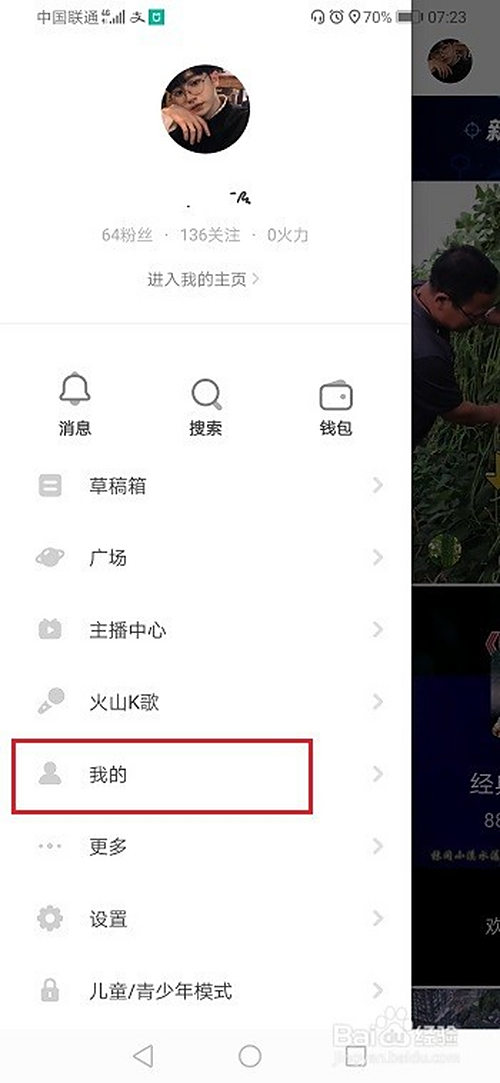 第三步我们也可以看一下火苗,打开抖音火山版侧边栏,点击我的,如下图所示: