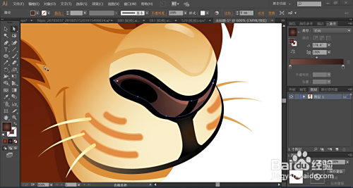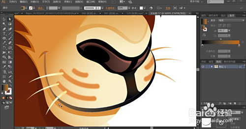 狮子的嘴巴用咖啡色的渐变与灰黑色的渐变搭配填充,再用淡咖啡色填充亮光,利用米黄色的渐变填充鼻头与嘴巴之间的布局件。狮子的胡子用浅黄色的渐变填充,嘴巴下方的外围轮廓用黑橙色的渐变填充。