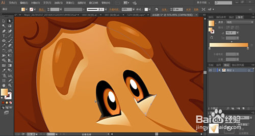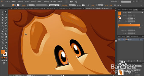狮子的眼晴用橙色的渐变与黑色搭配填充眼晴的外边缘,内部的瞳孔用口角色搭配,眼晴的下方用淡橙色的渐变填充出高光结果。