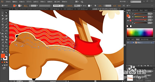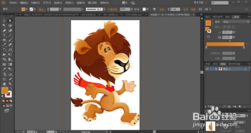 狮子的领巾用红色、暗红色搭配填充,领巾上面的图案用桔红色与桔黄色搭配填充。