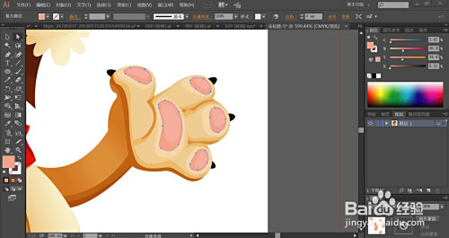 最后,狮子的手掌用两种粉红色与米黄色搭配填充,外边缘用橙色与暗橙色搭配填充,狮子的脚掌用暗橙色、米黄色、黑色搭配填充出细节路径的色彩转变结果,完当作奔驰的狮子卡通画设计。