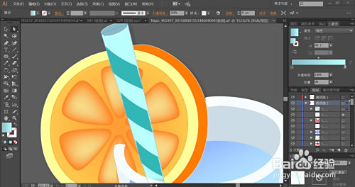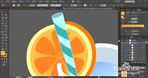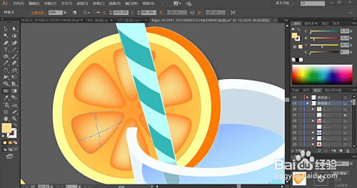 利用网格东西点击一下果肉的暗光路径让其呈现桔红色的渐变结果。吸管的路径用淡青色的渐变填充。