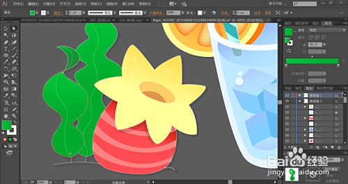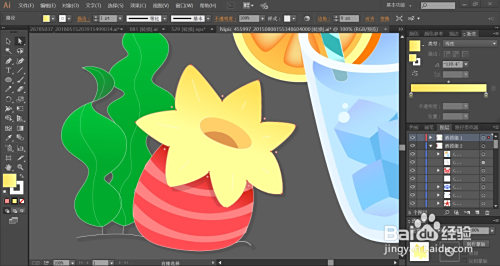 接着,我们用黄色的渐变填充左侧的生果的花朵,内部的花蕊用暗橙色填充。下方的生果用红色的渐变与红灰色搭配填充生果的本家儿体与高光路径。