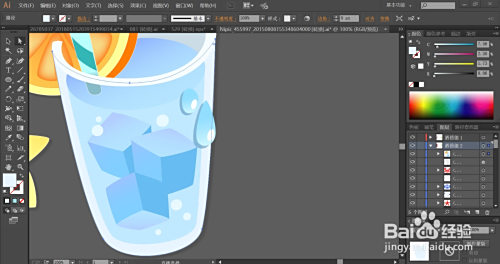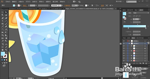 玻璃杯的内壁用蓝灰色填充,外壁用天蓝色填充。杯内的液体用天蓝色的渐变填充,杯内的冰块用天蓝色的渐变与蓝色搭配填充,冰块的两个侧面填充分歧明度的蓝色。杯外的水滴用较亮的天蓝色的渐变填充,再用白色填充亮光地点的路径。