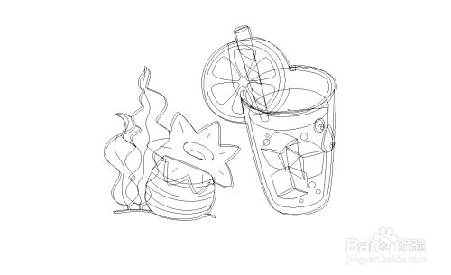 利用钢笔画出绿叶与生果的细节,再画出柠檬片的表里布局,接着,我们画出吸管与玻璃杯还有杯内的液体细节路径。