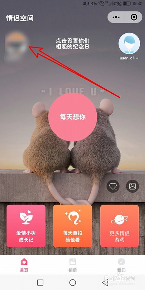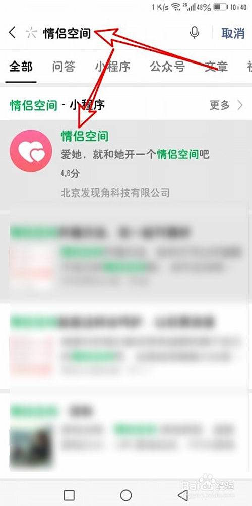 2、然后在搜刮框中输入情侣空间的关头词进行搜刮,接着点击情侣空间的小程序