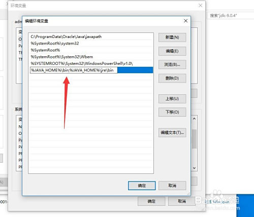 第九步,在弹出的path的最后面追加新增[;%JAVA_HOME%\bin;%JAVA_HOME%\jre\bin](win10若是无法复制那就点击编纂文本追加)