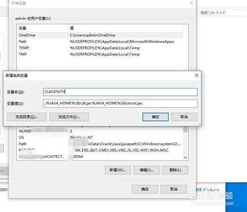 第七步,返回系统情况变量,再次点击新增按钮,新增CLASSPATH,里面的值为[.;%JAVA_HOME%\lib\dt.jar;%JAVA_HOME%\lib\tools.jar;],将大括号里的内容复制到值中