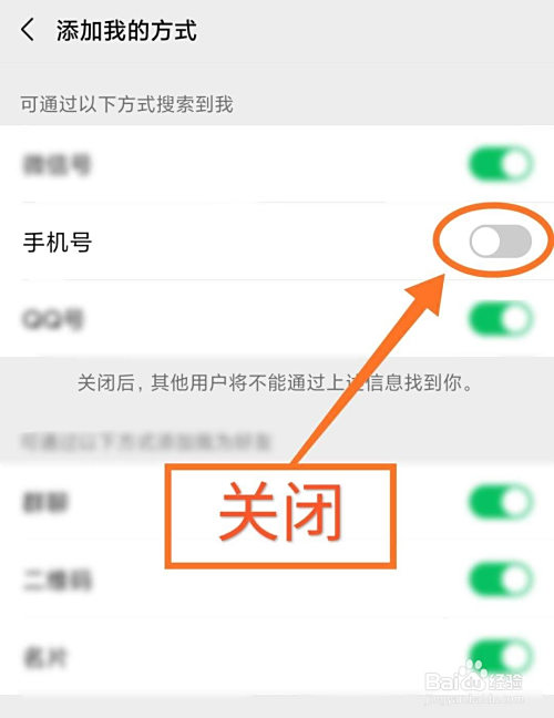 第四步:进入之后,在这里就可以查看到添加我为老友的设置,需要封闭手机号查找,封闭右侧的选择按钮即可。