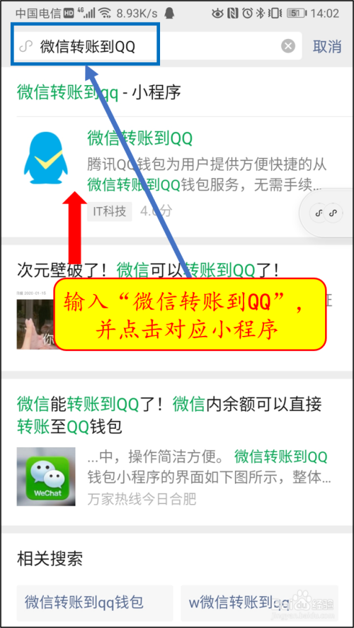在“搜刮小程序”输入框中输入“微信转账到QQ”,并搜刮,选择第一个小程序。