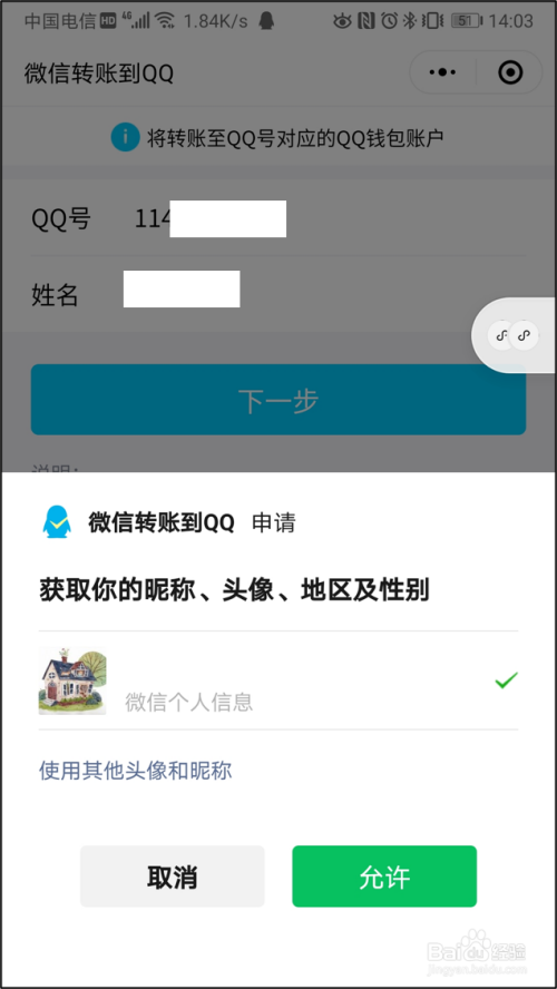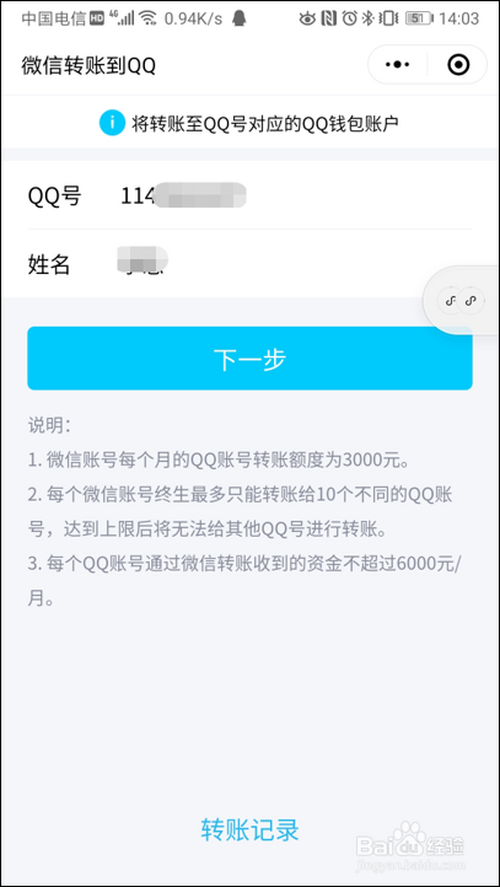 在“微信转账到QQ”界面输入对方或本身的的QQ号和姓名,点击“下一步”。