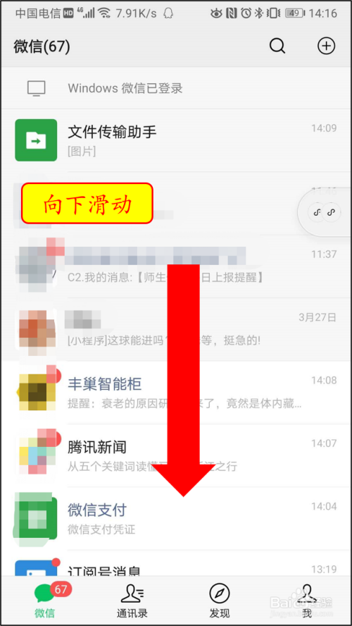 打开微信,在“微信”本家儿界面标的目的下滑动,进入小程序界面。