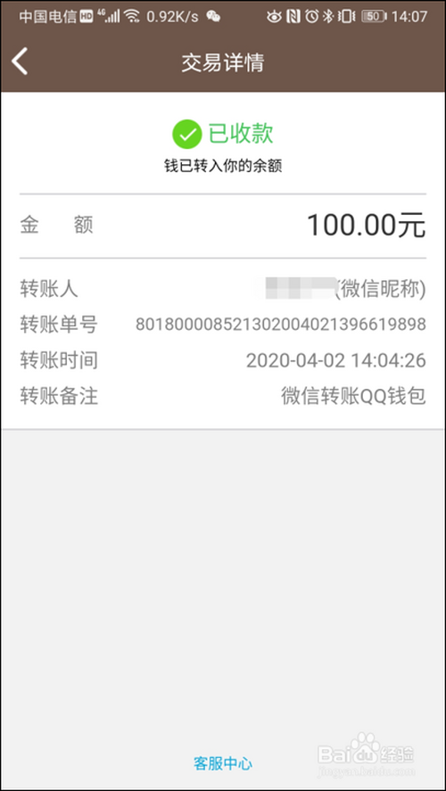 收条目方QQ用户收到的转账详情。