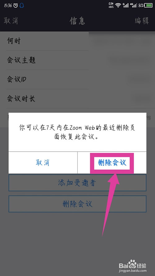 在打开的信息界面,能看到底部的删除会议选项,点击删除。如图所示