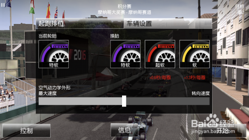 先来说说F1 2016的游戏设置,拿摩纳哥大奖赛为例。起头前会先选择您想驾驶的赛车及车手,接着便会进入到游戏选项:圈数,难度,是否损坏,是否出动平安车。当作功加载完进入角逐后,玩家便可以选择本身需要的轮胎以及下压力调整。十分真实。