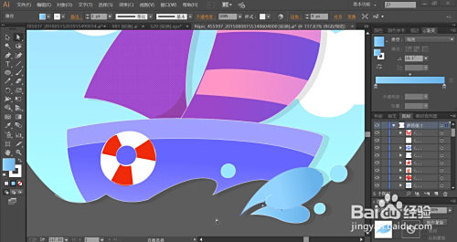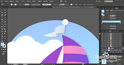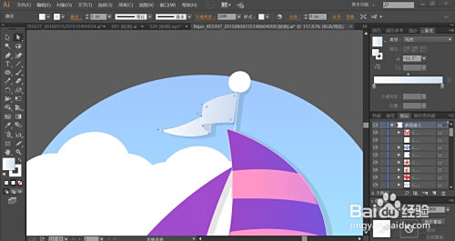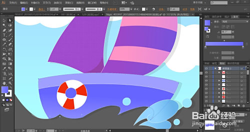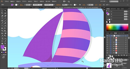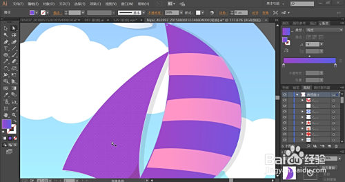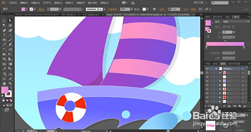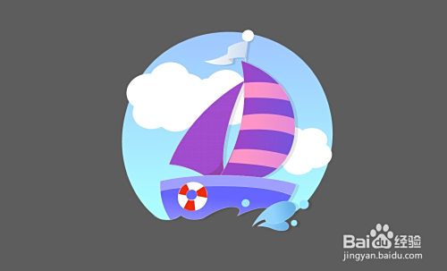 右侧帆船上面的条纹用粉红色的渐变填充,左侧的帆船用蓝紫色的圆点图案进行路径的填充,给帆船也画出暗影结果。