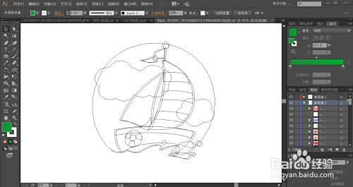 利用圆形东西画出天空地点的圆形,再用钢笔画出云彩的根基路径,接着,我们利用钢笔画出划子与上面的帆船、水滴等周边的元素路径。