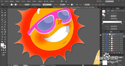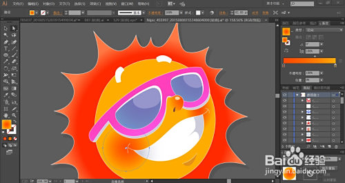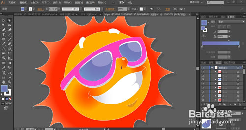 利用品红色与蓝色的渐变搭配填充太阳脸上的眼镜与镜片的路径,镜片的右上方的亮光用浅蓝色填充。