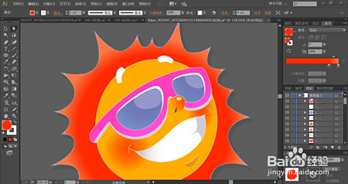 利用红色到桔红色的渐变填充太阳的曲线圆边的路径,再用橙色填充太阳的圆脸路径,利用橙红色到橙黄色的渐变填充太阳脸上的脸晕。