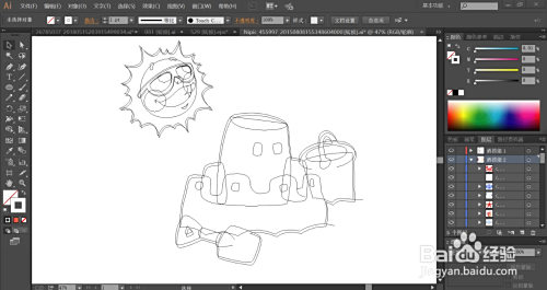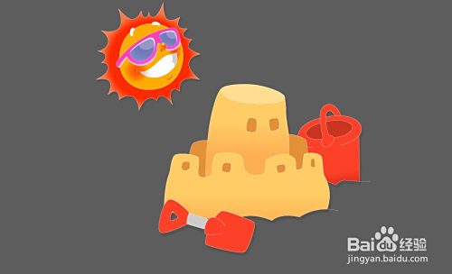 利用圆形东西与钢笔画出太阳的边缘光线曲线,再画出太阳的启齿笑的脸色,包罗脸上的眼镜与脸晕的细节,再画出太阳下方的沙堡的细节路径,包罗四周的水桶与铲子的细节路径。