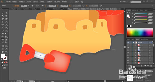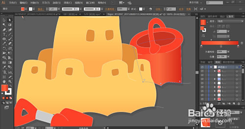 水桶用红色的线性渐变填充正面,水桶内部用暗红色填充,铲子用红色与灰白色搭配填充布局件,利用网格东西点击铲子的前端与中心让其呈现渐变色的质感结果,完当作太阳沙堡图片设计。