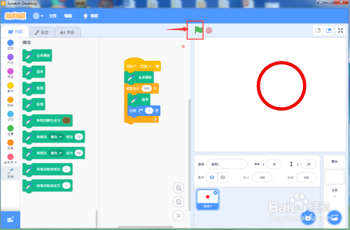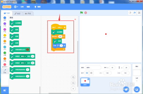 点击代码,给红色小点添加如下剧本,注重用到钤记,扭转1度和反复执行360次;