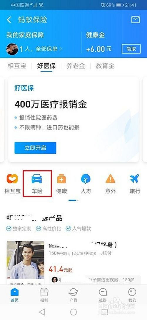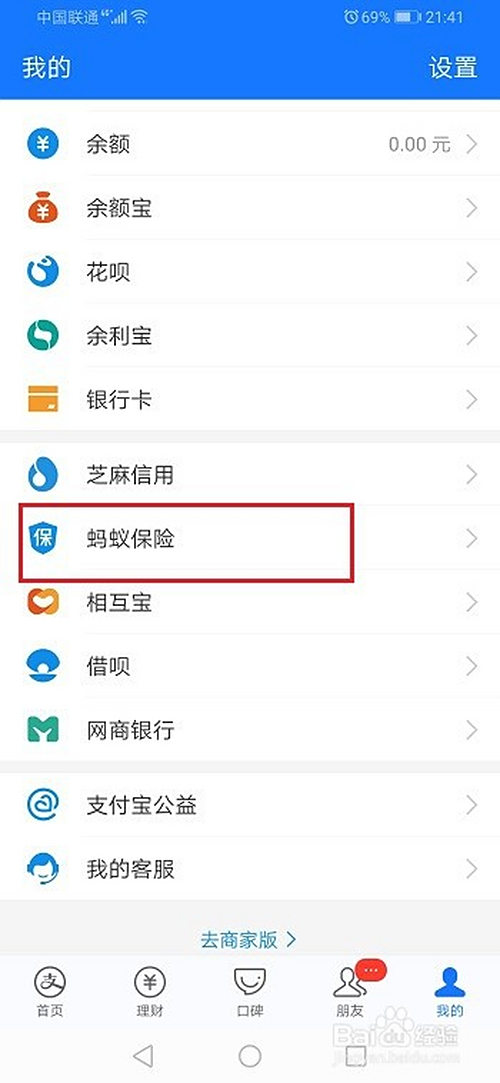 第一步手机上打开支付宝,进去我的界面,点击蚂蚁保险,如下图所示: