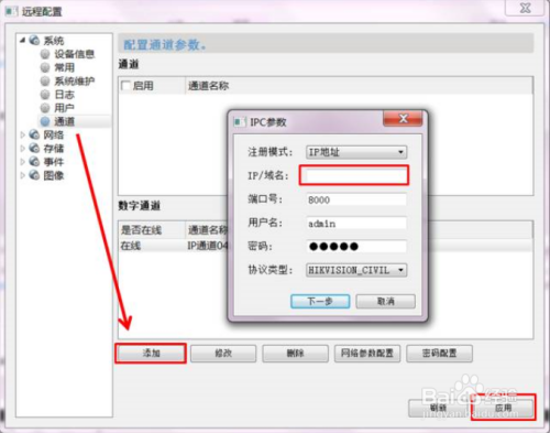按照“系统”——“通道”——“添加”,输入您需要添加的IPC的IP地址进行添加,设置完当作跋文得点击“应用”哦!