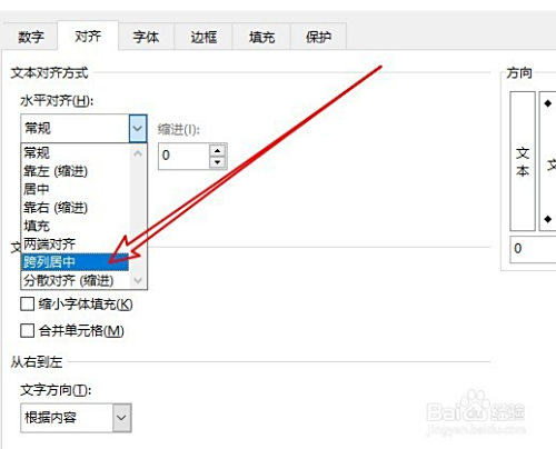 5、在弹出的下拉菜单中选择跨列居中的菜单项。