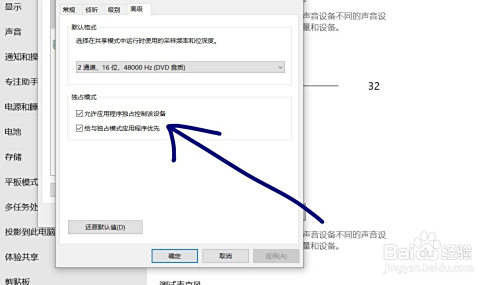 在“高级”中,找到“独有模式”下边的两个选项,全数打钩。