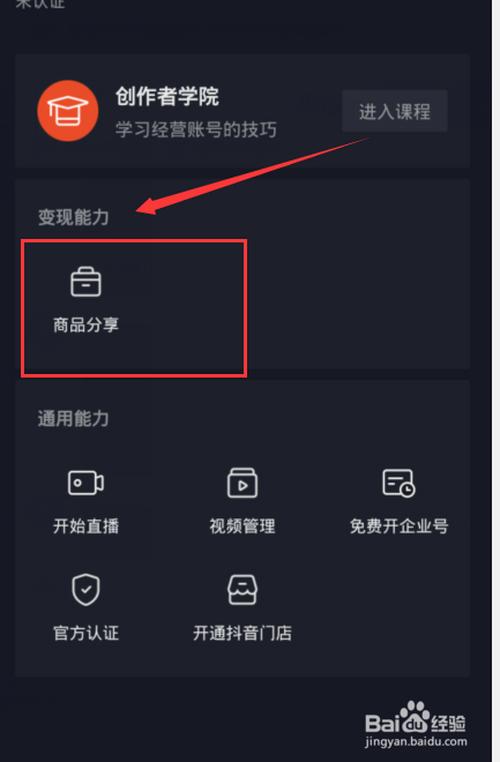 第五:在创作者界面点击【变现能力】下的【商品分享】按钮。