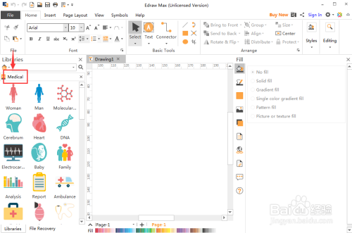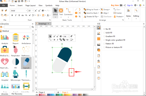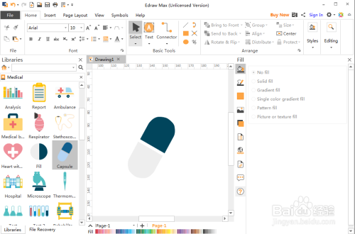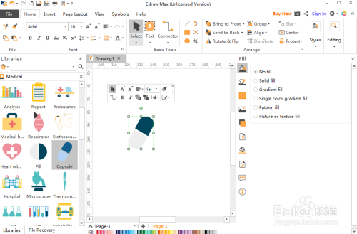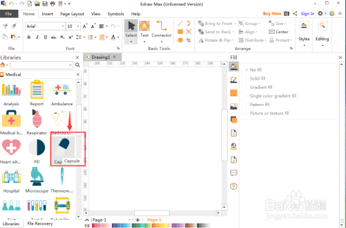 2、打开医疗符号库,找到胶囊图,用鼠标将其拖放到编纂区;