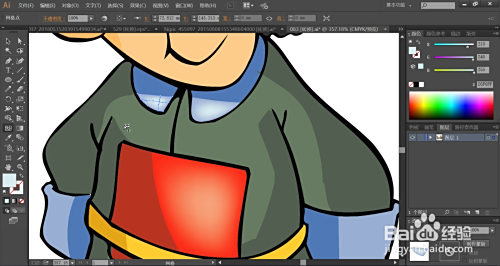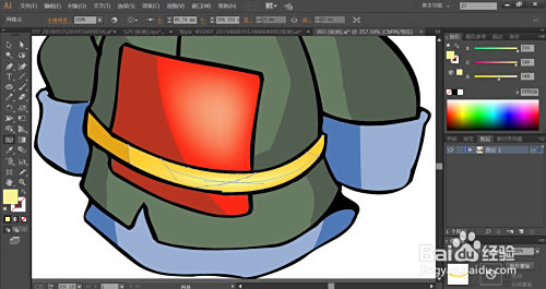 继续利用红色与暗红色搭配填充清人的服饰中心的方形图案,再用橙黄色填充清人的腰带路径。服饰的下方边缘用蓝色填充,利用网格东西点击红色块的亮光与腰带的亮光路径让其呈现渐变色。