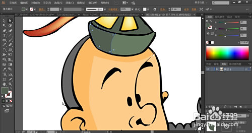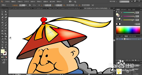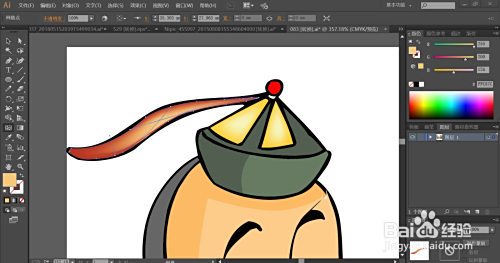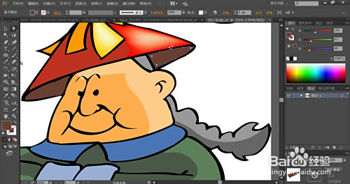 利用网格东西点击一下帽子上方的橙色让其呈现橙色渐变的结果,再用网格东西点击一下飘带让其呈现红棕色的渐变结果。汉子的脸蛋用土黄色填充,眼晴与嘴巴用黑色的线条来勾勒边缘。