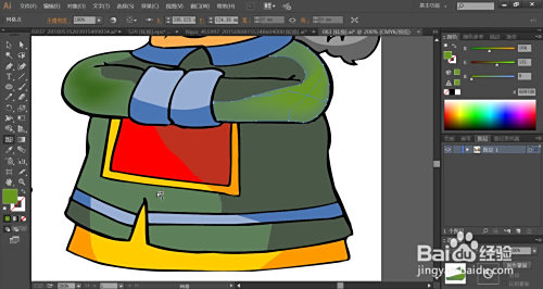 最后,我们利用绿灰色、蓝色、红色、橙黄色搭配填充衣服的本家儿体、衣领、袖口、图案、下边缘的路径,完当作清人形象设计。