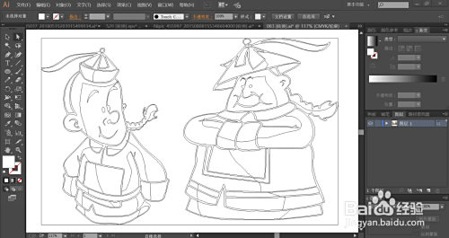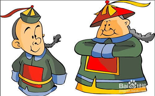 利用钢笔画出左侧清人的回身动作,再画出右侧清人的双手作揖的动作,再用钢笔画出他们的帽子的细节与服饰的衣领与袖口等元素的路径。