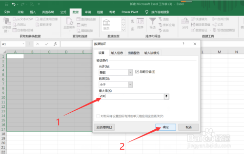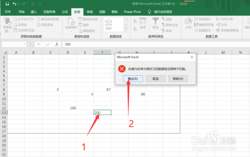 第五步:这样就只能输入比200小的数字了,输入其它数字就会提醒不匹配,点击【重试】