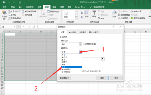 第三步:点击【数据】下方右侧的下拉箭头,选择【小于】