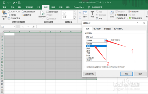 2、点击【任何值】右侧的下拉箭头,选择【整数】