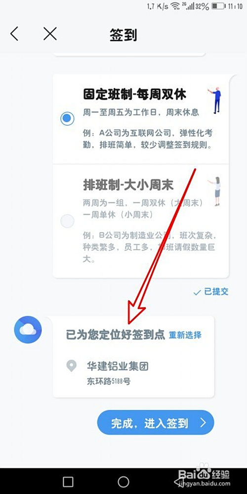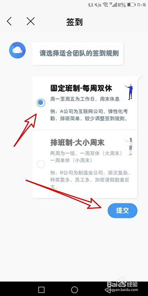然后在打开的签到页面中设置好班制的选项后点提交 按钮。