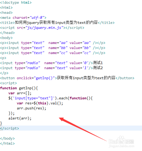 在js标签内,建立getInp()函数,在函数内,界说一个空数组arr,用于保留内容。再经由过程对象选择器input[type="text"]获得input对象,利用each()方式遍历所有input对象,再经由过程val()获得input内容,把内容放进arr数组中。最后,利用alert()方式将内容输出。