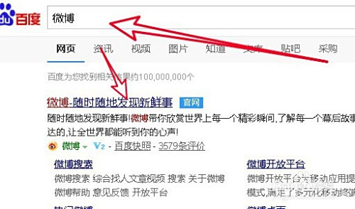 起首在百度搜刮微博的关头词,然后点击微博的快捷链接。