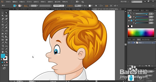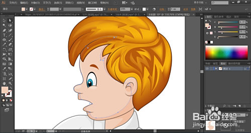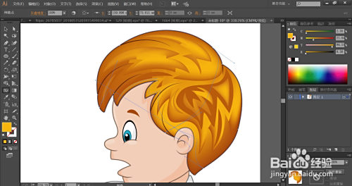 利用暗橙色与橙黄色搭配填充男孩的头发,再用网格东西点击一下头发的橙黄色路径让其呈现渐变色的结果。