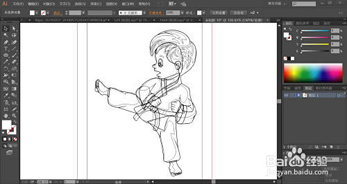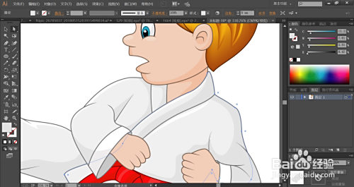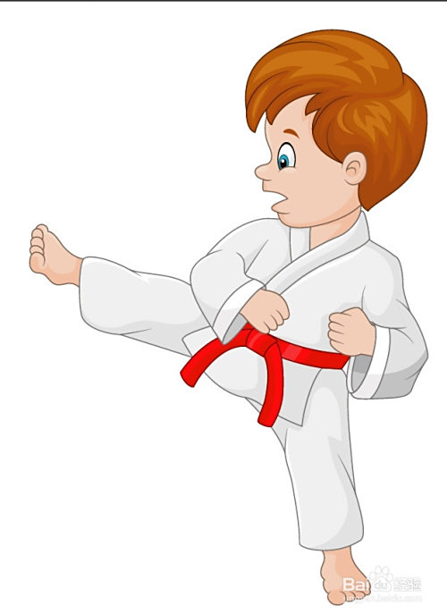 男孩的手掌与脚掌用浅粉色与暗粉色别离填充高光与暗光的路径,男孩的身体用土黄色进行描边,完当作跆拳道小子图片设计。