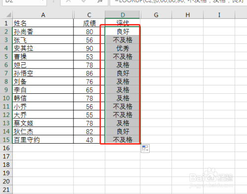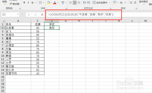 2、在D2单位格输入公式【=LOOKUP(C2,{0,60,80,90;"不合格","合格","杰出","优异"})】,按回车键,即可得出成就优良;