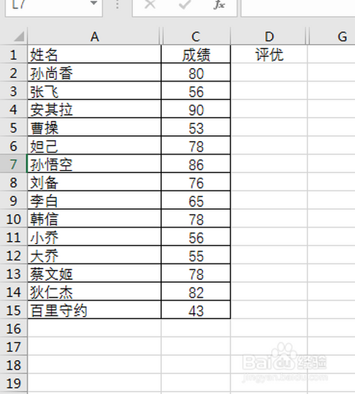 1、如下图所示,需要按照测验成就,来评定学生的优良;(成就大于等90的为优异,大于等于80的为杰出,大于等于60的为几个,其他为不合格)