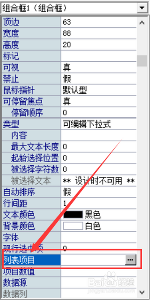 【单击】组合框,在右侧的设定菜单中选择【项目列表】,后面有【...】