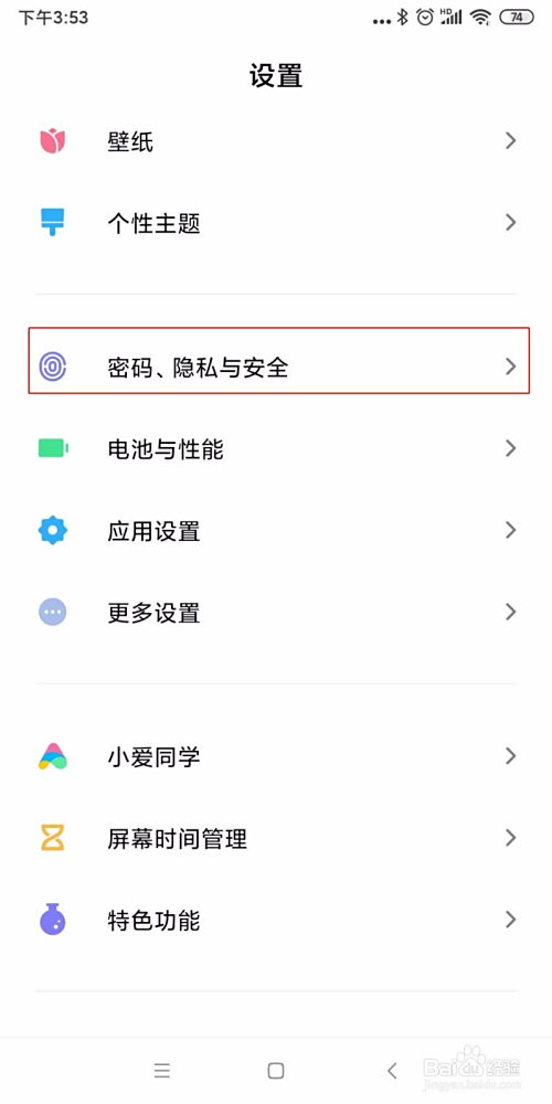 进入设置界面,选择暗码、隐私与平安。如下图所示。