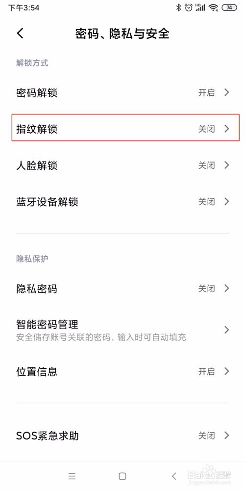 进入暗码、隐私与平安界面,选择指纹解锁。如下图所示。